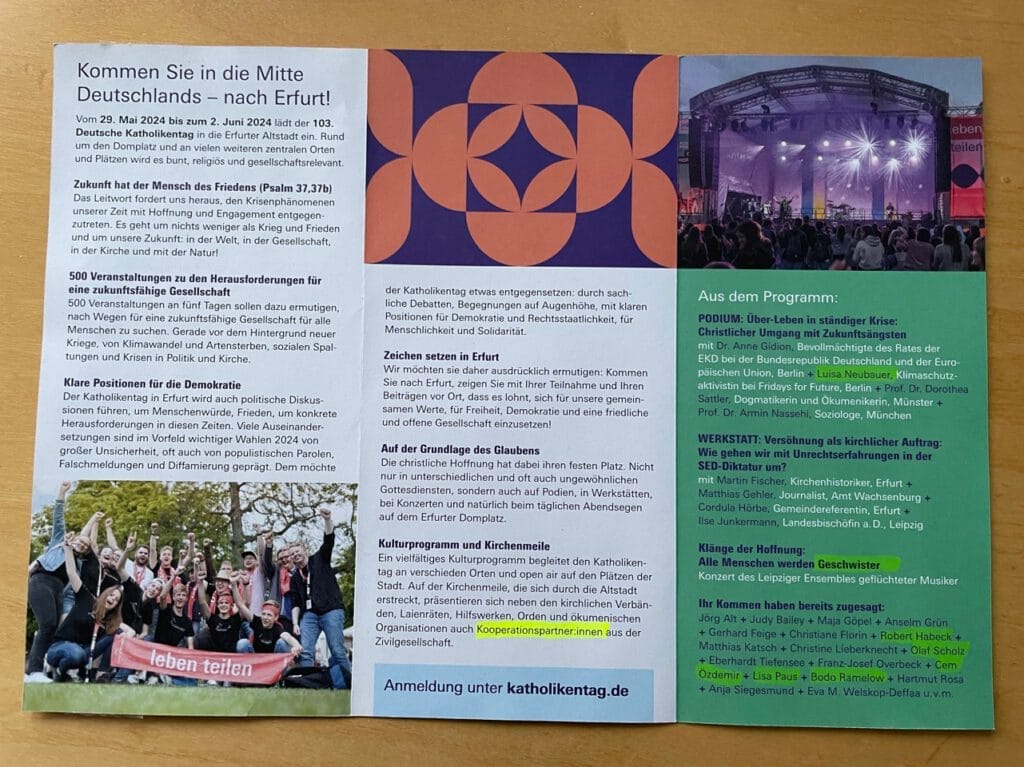 Worum es bei den Katholikentagen überhaupt geht. Sie sind ein Ort der Begegnung in der Kirche und mit der Kirche und werden vom ZdK gemeinsam mit dem jeweiligen Ortsbistum veranstaltet. „Sie gehören zum Ursprung der katholischen Laienbewegung und bilden auch heute ein wichtiges Zentrum in der Arbeit des Zentralkomitees.“ Im Prospekt für den 103. Deutschen Katholikentag in Erfurt sind wiederum ein paar sprachliche Besonderheiten, aber nicht nur, zu „bewundern“.