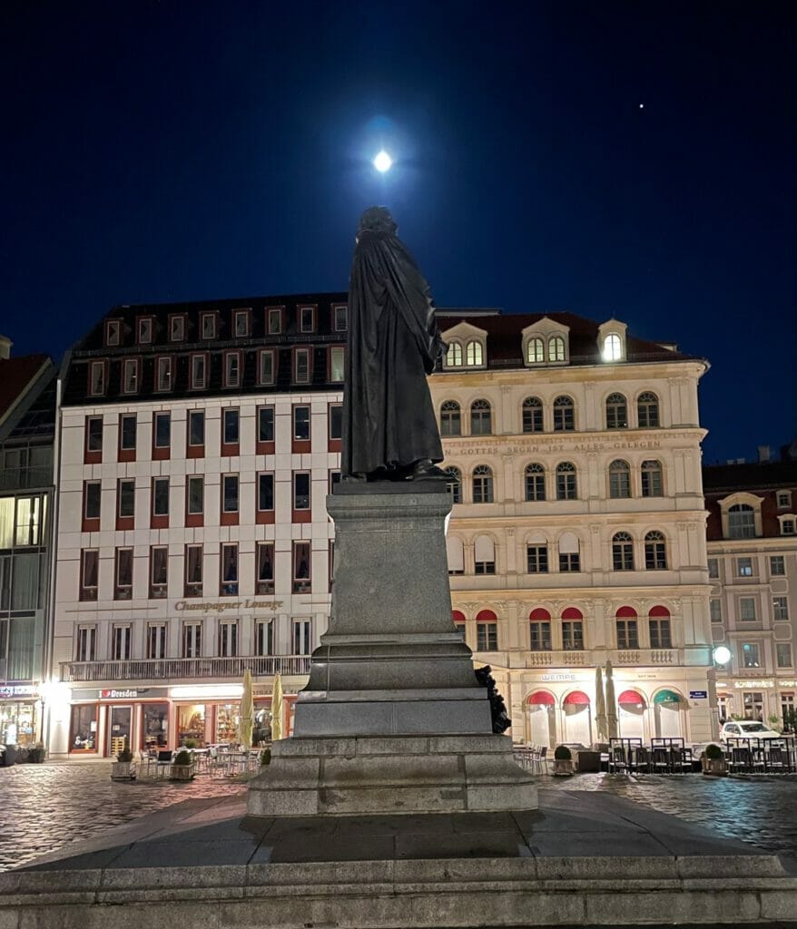 Vor der von 1726 bis 1742 errichteten, 1945 total zerstörten und 2005 wieder original hergestellten Frauenkirche steht jemand, dem regelrecht ein Licht – vor einer Woche bei meinem Besuch war Vollmond – aufgegangen ist. Wer es wohl ist?